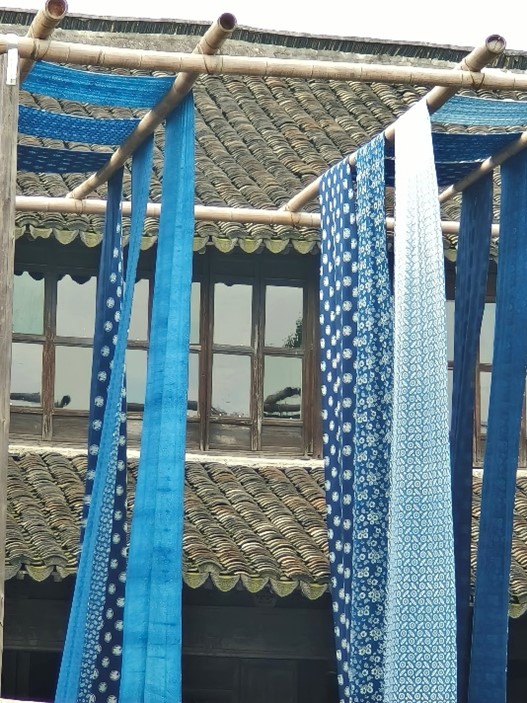 乌镇,素有“中国最后的枕水人家”之誉,是最典型的江南水乡古镇。在这里,街边的商户窗户下系着蓝印花布的布老虎,店面里摆着蓝印花布的独特衣裳,游客手中拿着蓝印花布元素的扇子……蓝印花布元素韵味独具。2014年,桐乡蓝印花布印染技艺成功列入国家级非物质文化遗产代表性名录,在时间的洗涤下,越来越散发宁静质朴的气质。为此,我们团队来到了乌镇西栅景区草木本色染坊学习了解这项非遗传承技艺。