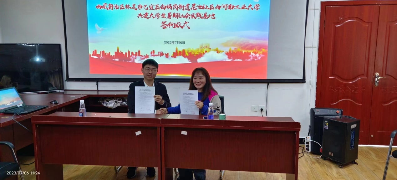 本网7月6日电(通讯员:秦梦杰 符策吉)2023年7月6日,河南工业大学与西藏自治区林芝市巴宜区白马岗村街道尼池社区达成社会实践基地合作的签约仪式在巴宜区白玛岗街道办事处尼池社区退役军人服务站举行。尼池社区驻村第一书记谭利、社区工作人员,河南工业大学“郑在林芝 爱在工布”赴西藏社会实践团队的全体成员出席签约仪式。