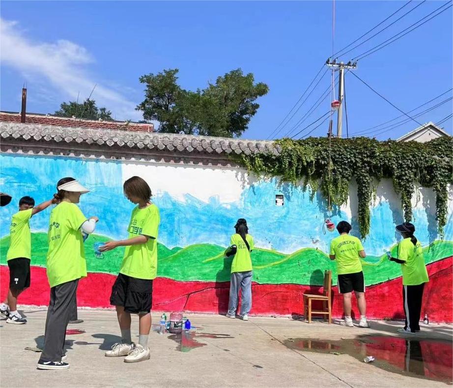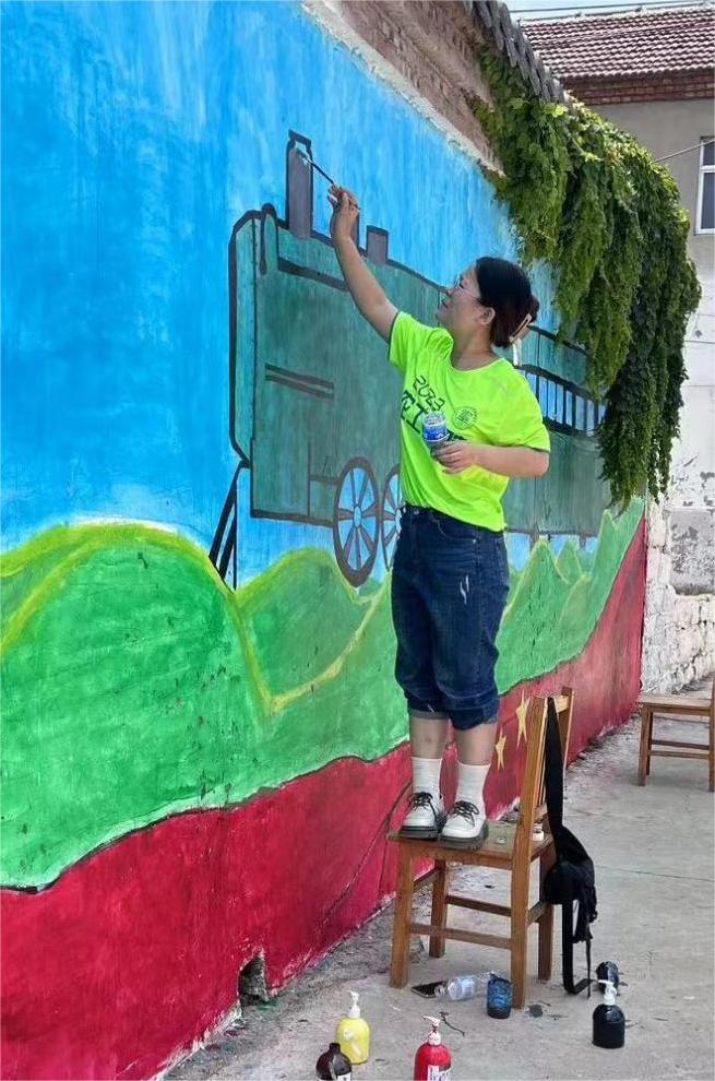 由于实践地距离较远且交通不方便,实践团成员们不得不选择步行前往目的地,为了展现乡村振兴的活力,村长选择绘制内容为一辆奔驰在乡村原野的绿皮火车,其原因为绿皮火车是新中国发展史开端的象征,奔驰在乡村的原野上,展示出我国现在不断的向新型乡村发展进步,充满活力和无限的希望。其次,绿皮火车在新中国的解放中提供了巨大的帮助,它和无数的先辈一样,都是红色精神的传承,奔驰在未来的道路上,预示着红色精神将会一直在中国发展道路上不断的发扬光大。在绘制墙绘中,各个团员分工明确,书法“宜居宜业 和美乡村”、填充分块区域、将各个区域的颜色涂抹均匀、为大家提供所需要的材料等各个过程有条不紊的进行,大家不断地修改弥补,努力让最终结果更加完美呈现,一幅美丽乡村画卷在成员们的努力之下徐徐展开。