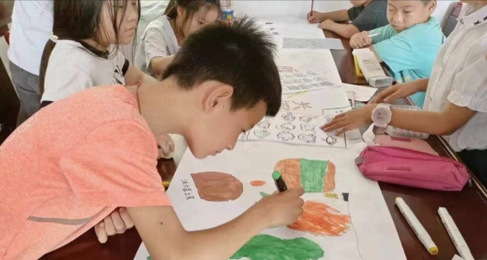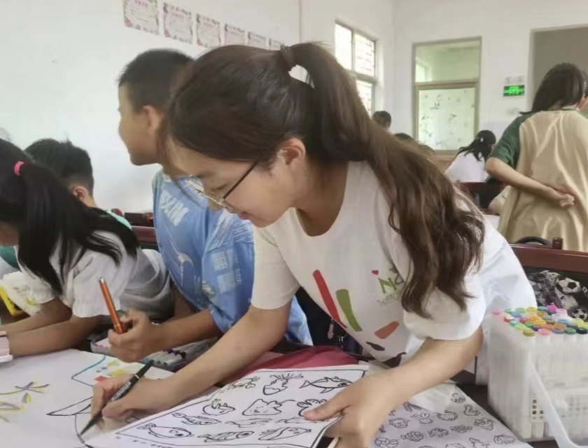 教育课堂之外,实践团成员俯身蹲下,他们倾听孩子们用稚嫩的声音铿锵地朗诵着古典诗文,站在孩子们的视角和他们一起用涂鸦的画笔探索美丽的世界。队员李婧漪在参加活动时有感而发,在笔记中记下这样一句话:“看见孩子们用稚嫩的笔触和五彩的笔墨将眼里的美好都映射在他们的画纸上,我也觉得这世界如此美好而珍贵。”