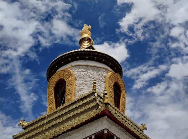 道孚素有“中国藏民居艺术之都”,的美称。团队走访观察到,镇上的藏式民居外墙体大多以“猪肝红色”漆料刷制,传统“崩科”式木制榫卯结构极具特色,道孚木雕技艺毫无保留体现在房屋的门、窗、檐上,尽显精雕细琢与鲜明大气之美。不仅仅是建筑,还有所见的生活用品及精妙的服饰,无不体现当地极具特色的民族艺术成果,阳光下的玛尼石堆和高耸白塔,给人庄严肃穆、宁静祥和之感。