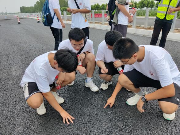 在学中干,在干中学,在项目推进中搞科研,在不断探究中解难题。实践队重点了解其公司就项目施工问题所进行的的实验革新,参观新型模块化混凝土路面,并与传统沥青路面进行对比,可有效防止车辙产生,实时监测道路运营状况,便于后期维护。此外,在孙总工的带领下,实践队还参观了沥青摊铺现场和桥梁建设现场,现场感知路面的多层结构和沥青铺设,实际了解桥梁建设过程中可能出现的问题和相应的解决方案。