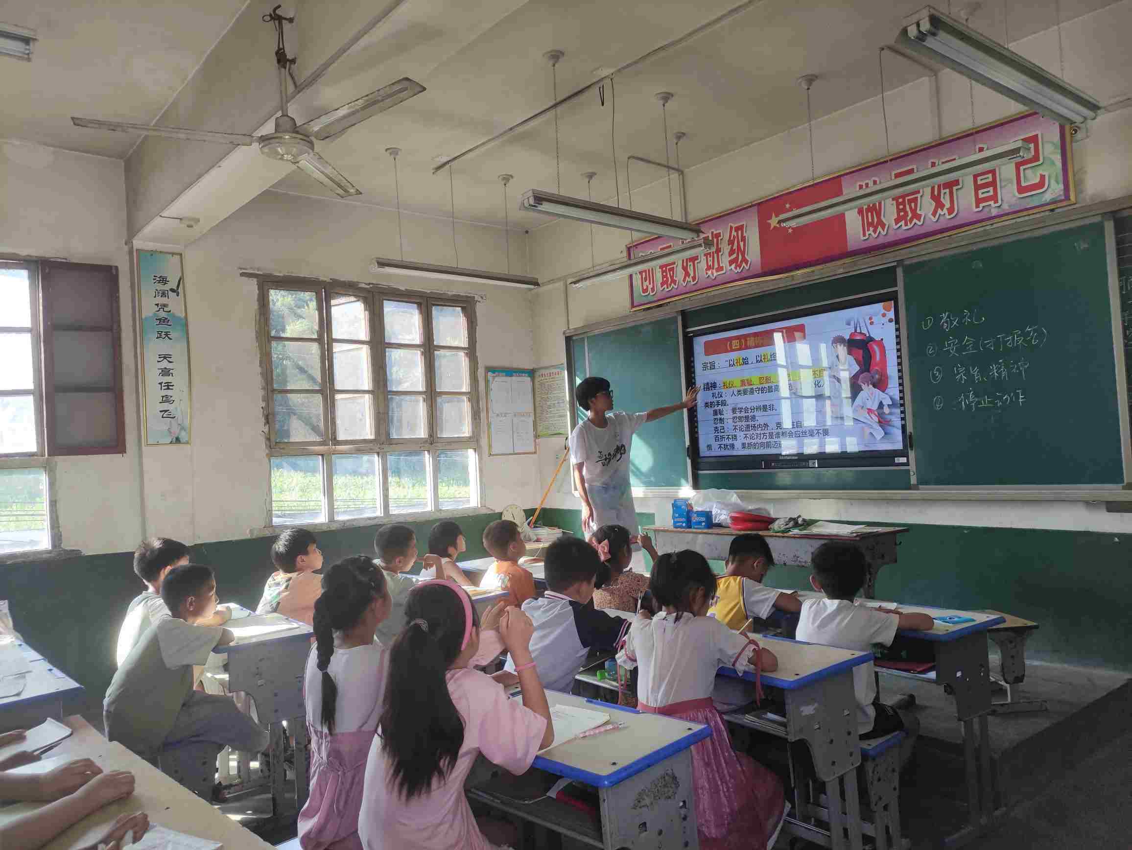 2023年8月3日,中国石油大学(华东)鲁豫相约支教队各支教队员进班开始讲解自行设计的课程,进行自我介绍及后续课程安排与期望,带领同学们走进不同的兴趣课程中。跆拳道,剪纸,手工等兴趣课程深受大家的喜欢,同学们下课后积极向队员康达了解后续剪纸步骤,期待下节剪纸课的到来。支教队员沈舒为使跆拳道教学更加专业,自行着装道服,并携带跆拳道靶,让大家更能深入的学习。支教队员杨舜迪的心理课程,用缓慢的语调与舒缓的音乐相结合,让心理健康的课程更加通俗易懂,更加深入孩子们的心,了解孩子们的真实心里状况。