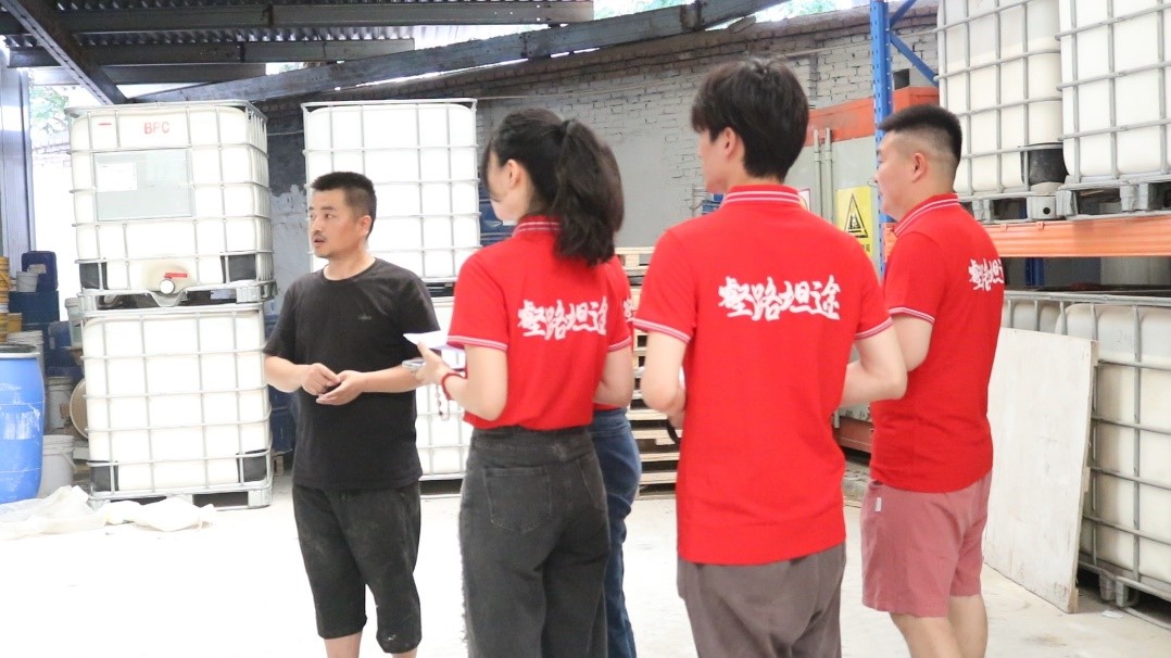 实践队员首先来到生产车间,全面学习了路面修补材料的制备流程、路面修补材料研究的探索现状、现代技术赋能传统农村路面修补的结果。通过对路面快速修补材料的生产、制备流程进行观摩,切实感受路面修补新材料研发在农村产业服务与产业发展方面取得的成效。