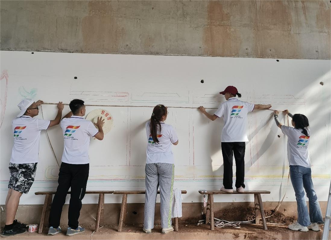 夏日高温难耐,在太阳的照射下,一切工作都显得格外艰辛。不仅如此,完成好一幅墙绘很难,首先要把框架画出来。等到真正上笔后我才发现,画一条直线就是一件非常不容易的事情,需要几个人将卷尺拉好,然后一点一点顺着卷尺画,稍有不注意,就会画歪,一条直线画不好,就会影响整幅作品。作为一个墙绘小白,我倍感压力。但是大家都互相理解,即使没有做好,也不会互相责怪。我们分工合作,有条不紊的进行着,大家互帮互助,哪里有需要就去哪里。即使出现了很多突发情况,大家都一起面对,共同解决问题。终于,功夫不负有心人,在团队的合作下,今天的任务得到了圆满完成。