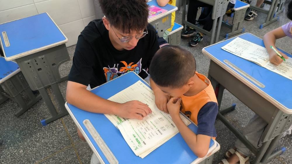 图为蒲公英支教社会实践团队成员一对一辅导孩子作业。