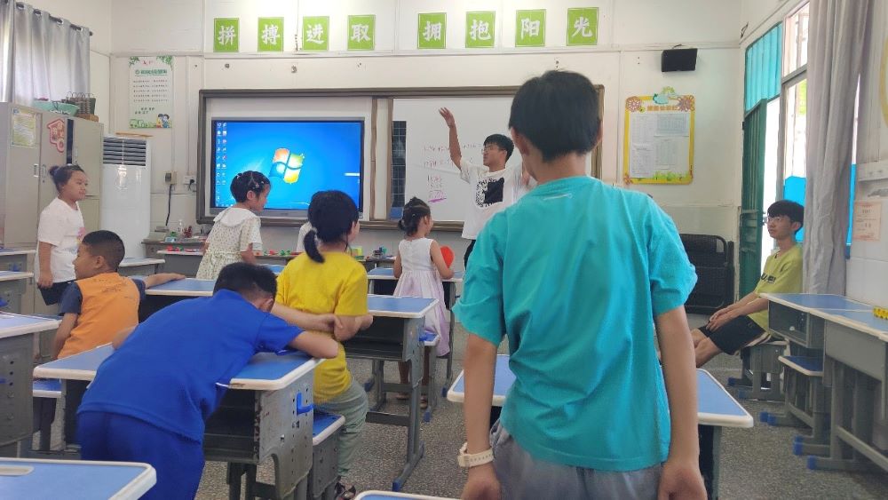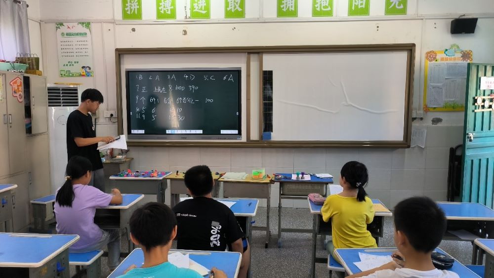 图为蒲公英支教社会实践团队成员为孩子们讲解数学题。