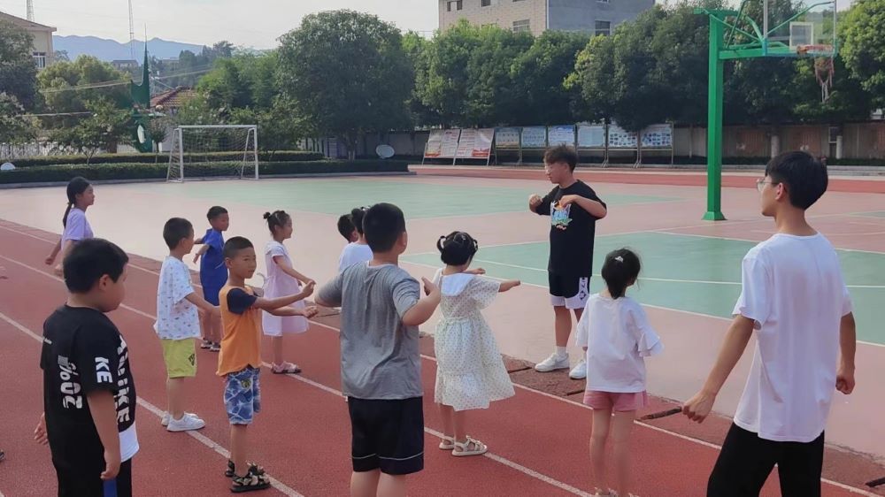 图为蒲公英支教社会实践团队成员与孩子们一起做游戏。