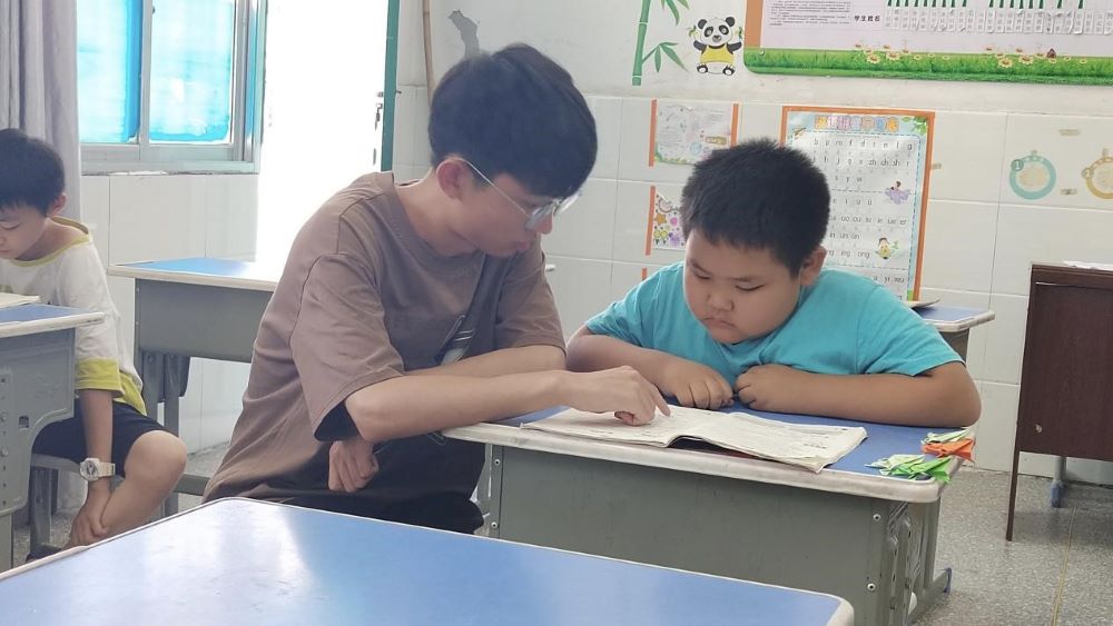 图为蒲公英支教社会实践团队成员给孩子辅导作业。