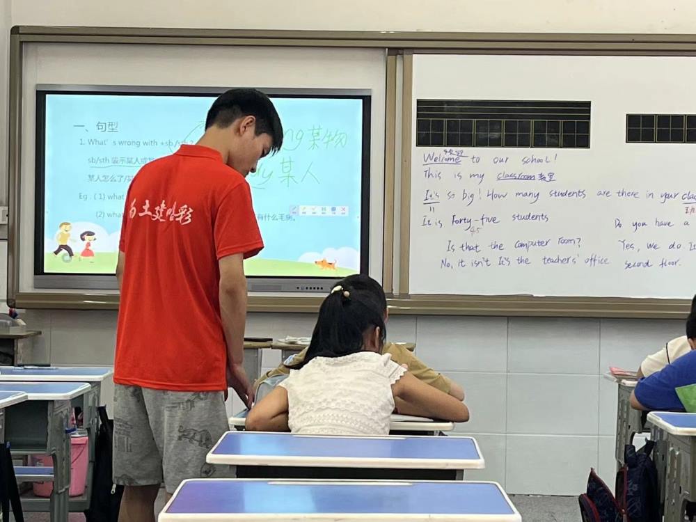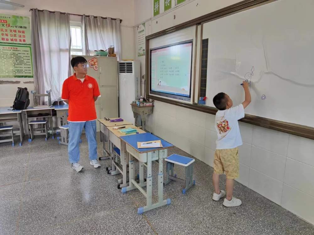 图为蒲公英支教社会实践团队成员给孩子上英语课。