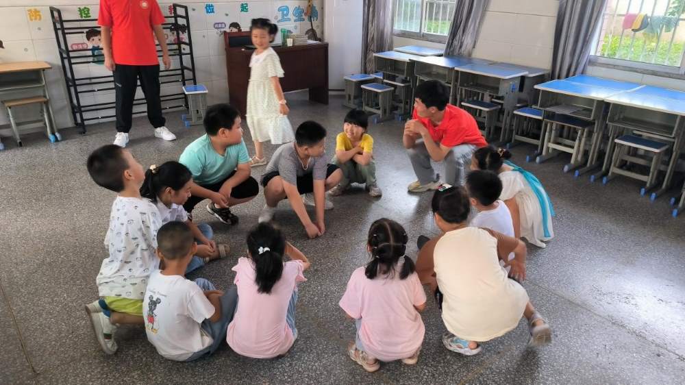 图为蒲公英支教社会实践团队成员带孩子们玩游戏。