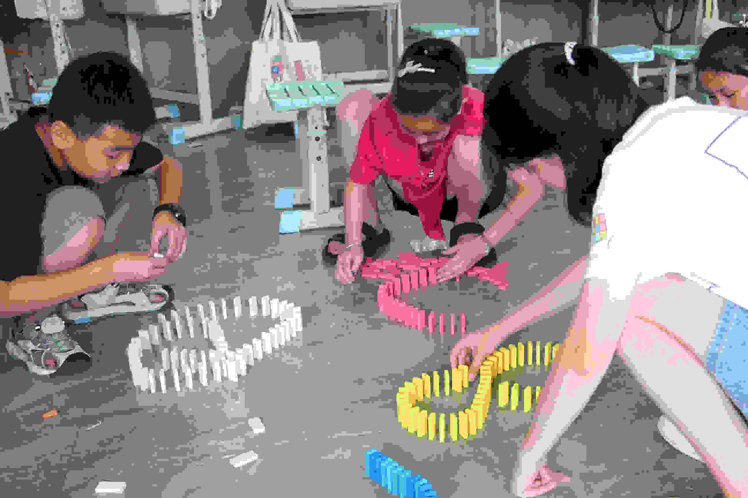 望曦队二营志愿者正带领学生摆放多米诺骨牌 张昭勖摄