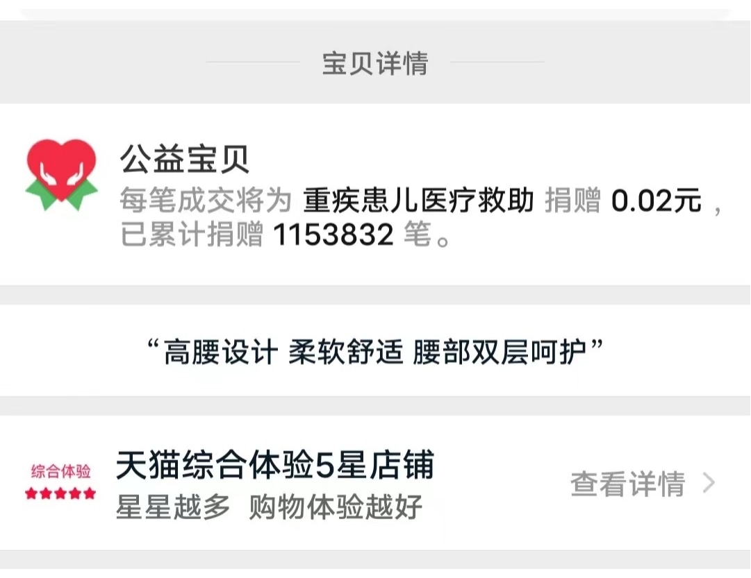 “我们会挑选热销产品参与淘宝爱心宝贝公益计划。买了一款产品之后,它扣两分钱当做捐赠金额,目前卖了多少笔,就有多少个两分钱捐赠到计划里。我们店参与的计划是偏向关爱儿童、扶残助残、疾病救助等等方向。”