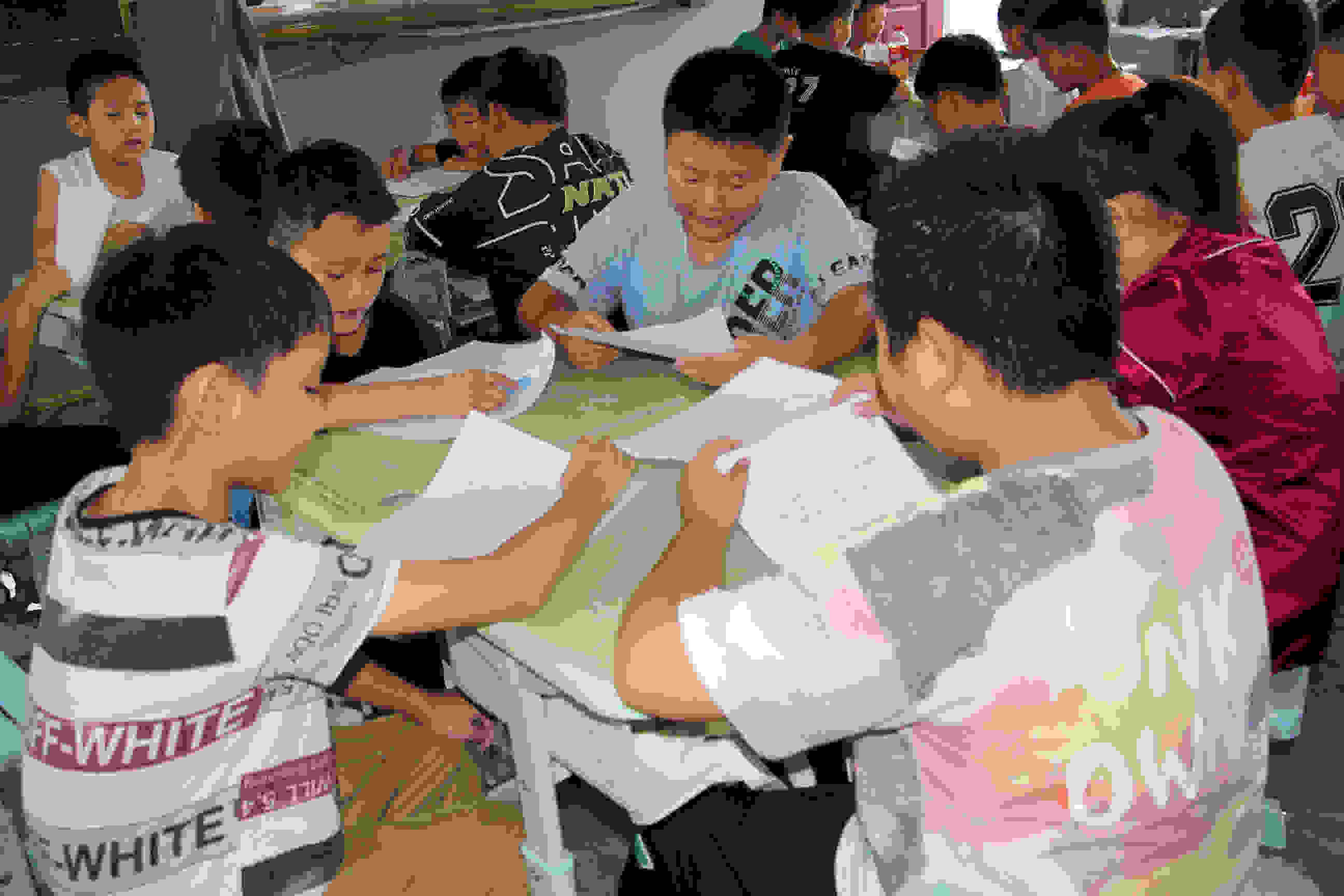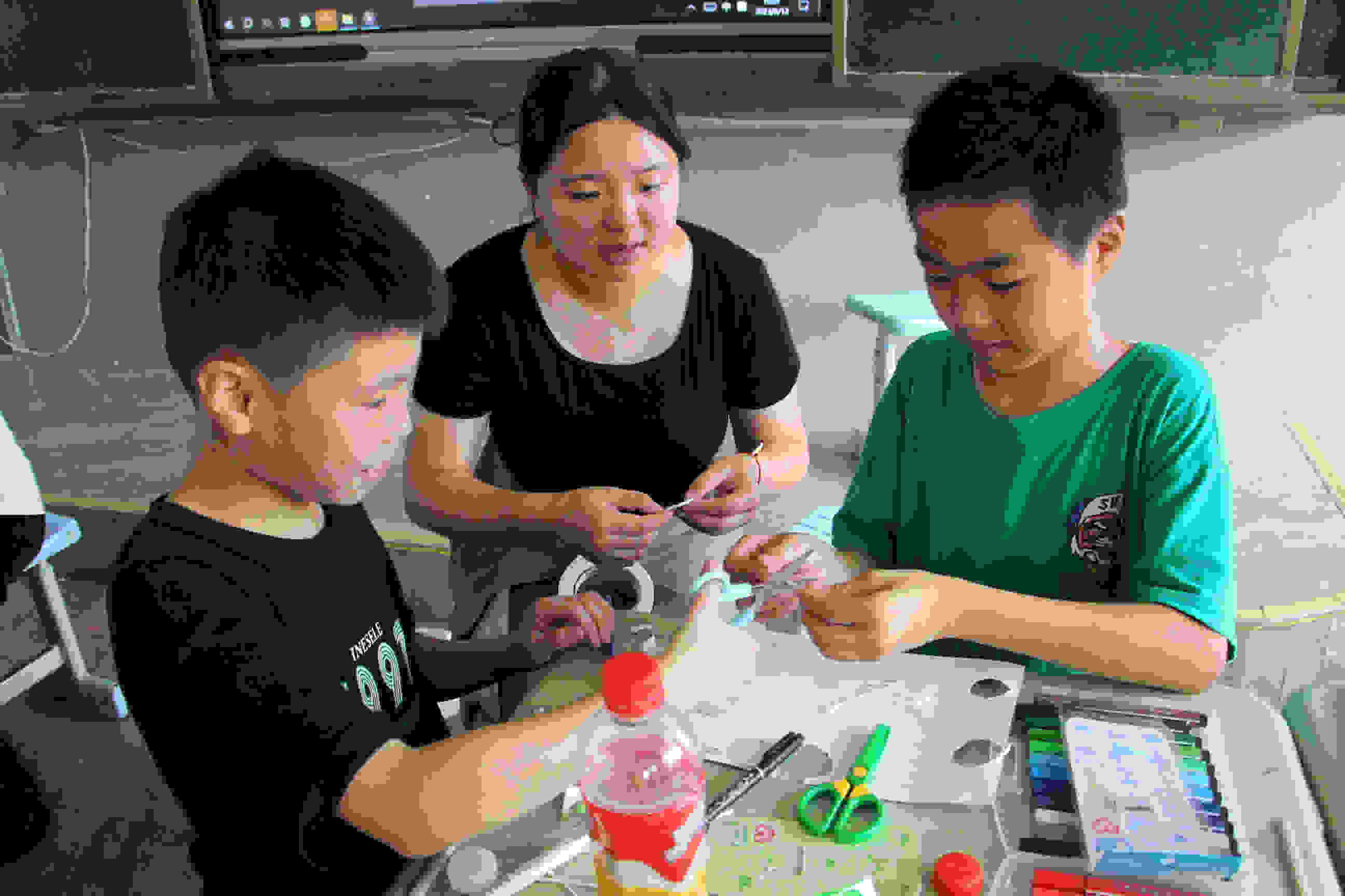 志愿者正在引导孩子们制作游戏道具 吕创基摄