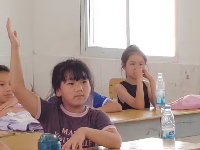 图为小朋友上课积极举手回答问题,与志愿者互动