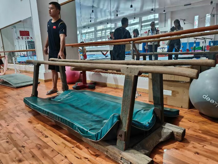 图为刘教练向团队介绍榕江第一代体操教练制作的已有60多年历史的双杠。黄杰 摄