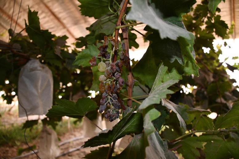 新疆农业大学小葡萄团队针对种植户提出的生产实际问题,实地查看了各个葡萄种植棚的情况,针对当地引进的葡萄新品种阳光玫瑰、妮娜女皇、户太8号、甜蜜蓝宝石在当地出现严重日灼和叶片焦枯现象主要是因为入伏之后该地空气温度39-42摄氏度和强烈的光照辐射,中午时分达到17万勒克斯,设施温室建立于塔克拉玛干沙漠上,沙子上午蓄积了大量的热能,下午逆辐射反射光和热使得地表温度71摄氏度,提出应对措施半天光照让葡萄进行光合作用,15点以后通过卷帘机放下幕帘到地面1.5米,晚上揭开帘子,从而既可以避免强光辐射又可以满足葡萄生长发育的光合需求。从树形培养和修剪方式上将以前4叶1心的摘心留果方式变革为保留8-10片叶,保留更多叶片便于遮挡果穗防止阳光直射。