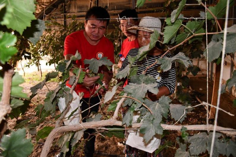 与种植户交流大棚内葡萄管理经验