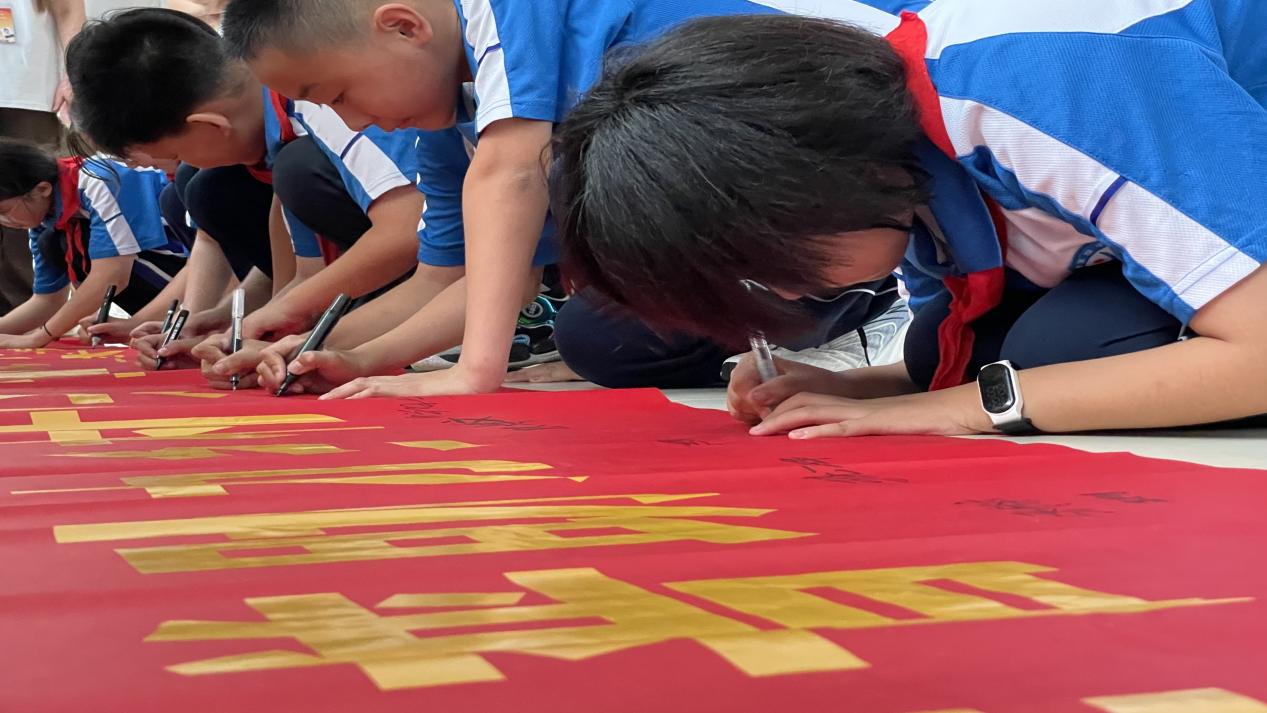 在“推广普通话,我们在行动”社会实践志愿服务专项行动结束阶段,溯梦沂蒙团队举行“推普助力乡村振兴”签字仪式,该团队成员和沂源四中的老师引领参与普通话课堂的学生们,参加“推普助力乡村振兴”签字仪式活动,在横幅上写下自己的名字。