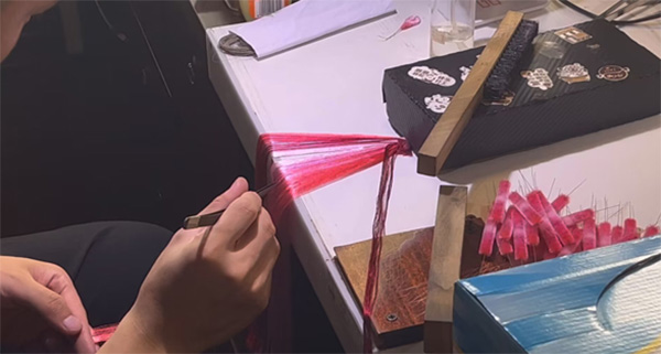 首先,要将蚕丝煮熟后的熟绒,染成不同的颜色,制作绒花花瓣和花蕊的材料。再用烧至退火软化的黄铜丝捻成螺旋状,成为“绒条”——做绒花最基本的部件。接着,用剪刀对绒条进行修剪、加工,变成各种形状,即为“打尖”。最后再攒成各种花式,一朵绒花才算初步完成。