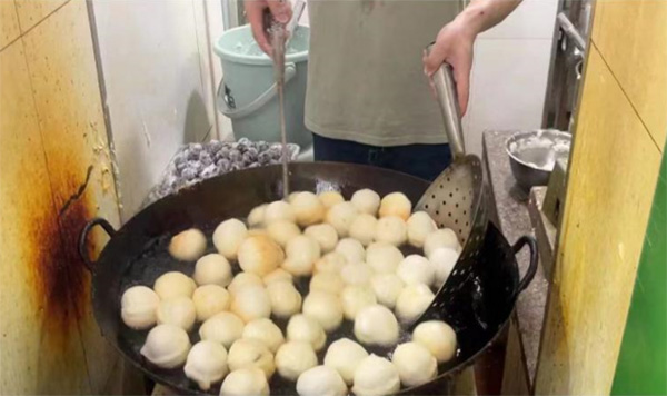 在“炸”的过程里,要求一直不停地翻滚,让蛋清羊尾充分“发”起,一个个丸子像乒乓球一样,浮在油锅中,胖乎乎,黄澄澄。