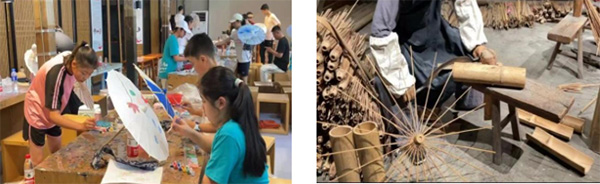 成员们在手工艺活态馆志愿者那里了解并体验了油纸伞的制作过程,以“号竹料—制骨架—裱伞面—上绘—刷桐油”为主要工序,以手工削制的竹条做伞架,以涂刷天然防水桐油的皮棉纸做伞面,纯手工制成,全部取材于天然,是中国古人智慧的结晶,堪称中国活化石。