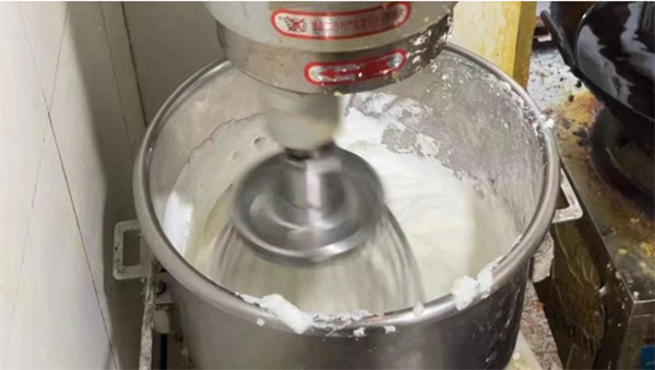 第一步是蛋清打发,现在多用电动打蛋器,要打发至筷子立而不倒。食材就是蛋清,因为它的形状特别像羊的尾巴而得名。