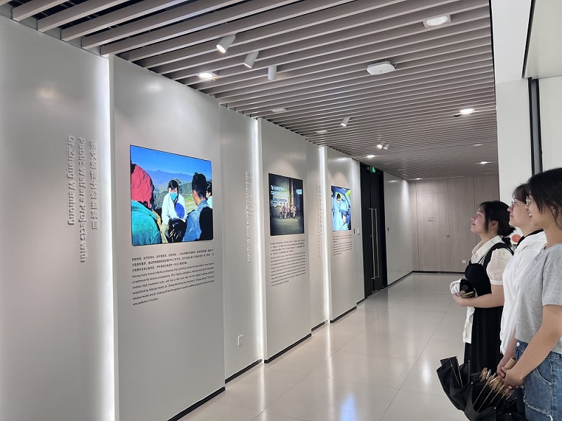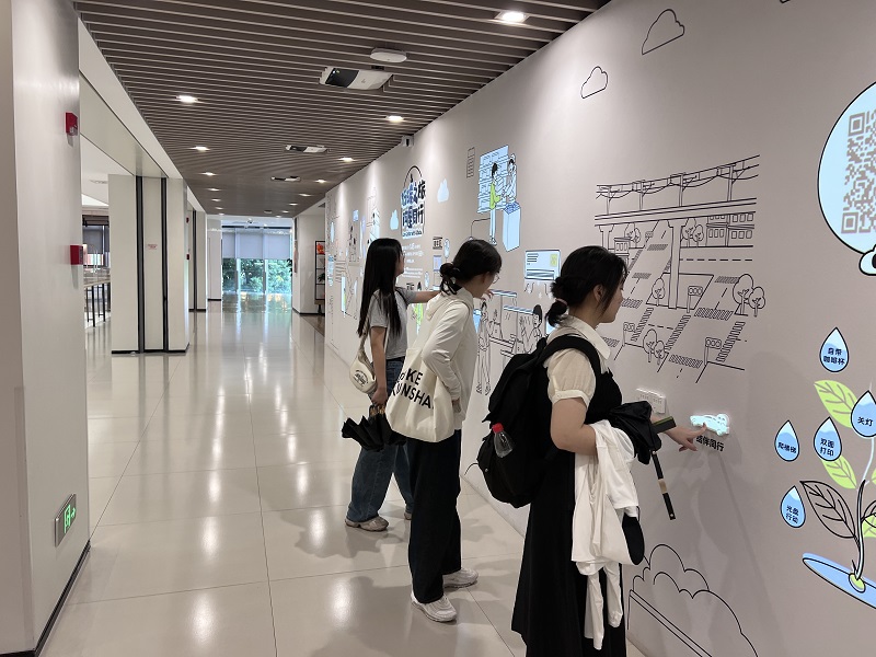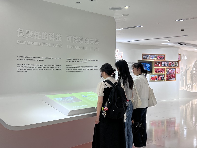 在以上背景的基础之上,实践团成员在阿里巴巴西溪园区访客中心进行了参观。穿梭在大楼的四层楼中间,成员们认真阅读了墙壁上关于阿里巴巴集团在各方面的发展过程及成就介绍,例如经济的数字化发展、环境的碳中和目标等,通过参观式的阅读,成员们对阿里巴巴整个集团的涉及领域有了更深入、更精准的了解;除此之外,成员们还亲身体验了通过投影、触屏等多项技术交融而成的交互式体验板块,新颖的智能互动再一次将实践团的参观氛围推向高潮,使其对于“数字化”有了更直观的认识。仅通过体验访客中心,园区的智能化、数字化便可见一斑,成员们也更加深刻地认识到数字经济现有发展成果取得的不易,同时作为大势所趋,数字经济未来的进一步发展充满了重要性和必要性。