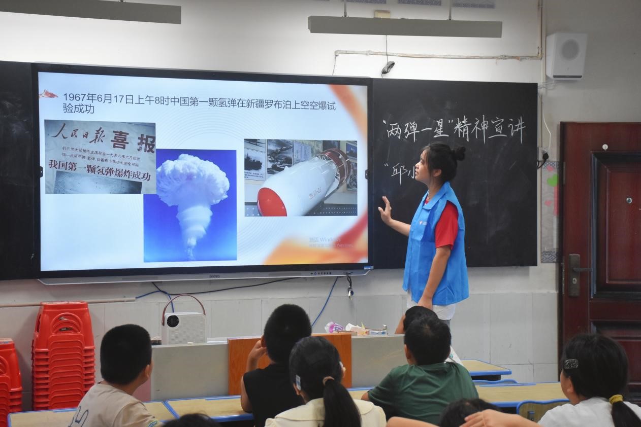 为进一步强化小朋友们对“两弹一星”精神的理解,8月22日,吉首大学物理与机电工程学院物语青年·小桔子阳光成长志愿服务团调研宣讲组来到吉首大学师范学院附属小学教育集团砂子坳小学,为小朋友们带来了一堂生动精彩的“两弹一星”精神教育宣讲课程。旨在让小朋友们加强对“两弹一星”精神的理解,增强对祖国的认同感和责任感。