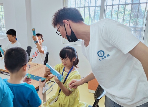 图为队员教当地暑托班学生制作手工作品