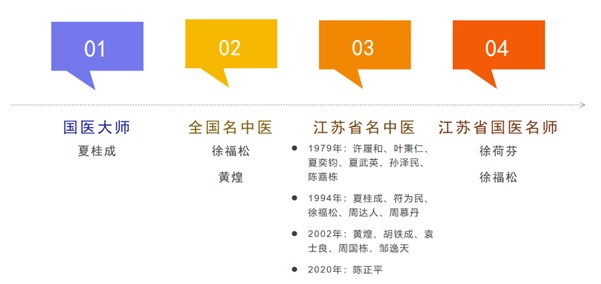 江阴籍国医大师夏桂成,早年师承江阴名医夏奕钧老先生,后求学江苏省中医进修学校,留校任教,创中医妇科“调周法”治疗月经病和不孕不育症,创新中医妇科学体系,被誉为“送子观音”;全国名中医徐福松教授,师从其父著名儿科专家惠之公及舅舅许履和先生,中医男科学的创始人和奠基人;徐荷芬,著名中医肿瘤专家,江苏首届“国医名师”;黄煌,全国名中医,当代经方派代表人物,致力于经方的国际传播;顾植山,全国第六批、第七批老中医药专家学术经验继承工作指导老师,五运六气大家;袁士良,江苏省名中医,全国基层名中医,师从柳宝诒再传弟子薛铭章,创“清化论”,力主“病多痰湿,法从清化”治病理念,擅用温胆汤,业界称之为“袁温胆”;陈正平,江苏省名中医,师从夏奕钧老先生,以妇科内科病见长