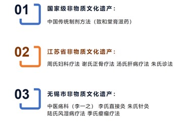 截至目前,有江阴籍国医大师1人,全国名中医2人,江苏省名中医16人,江苏省首届国医名师2人;国家级非物质文化遗产1项,江苏省非物质文化遗产4项,无锡市非物质文化遗产5项。