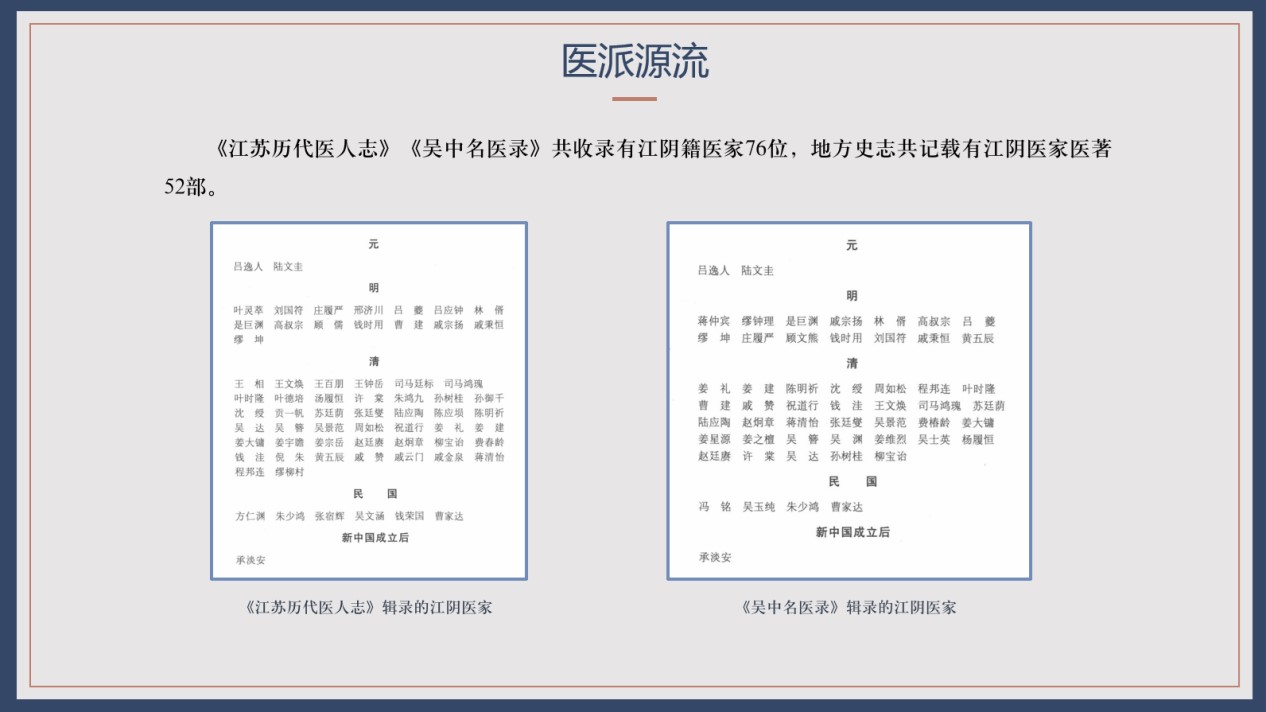 由此可见,“澄江”作为江阴之别称已有近千年之历史,历代江阴的文人、士人、医家亦有用“澄江”指代江阴的习惯,因此以“澄江”命名江阴地区的中医流派,既能反映地域范围,又能体现历史特色。