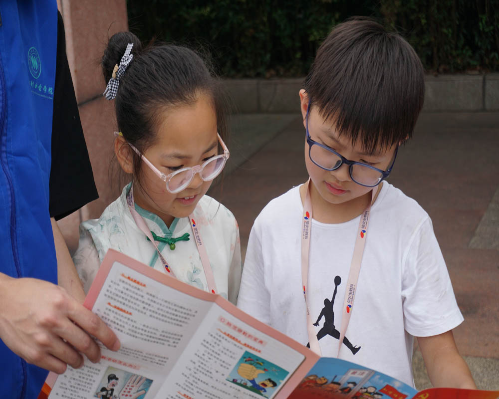图为实践队员带着小朋友阅读反邪宣传手册。