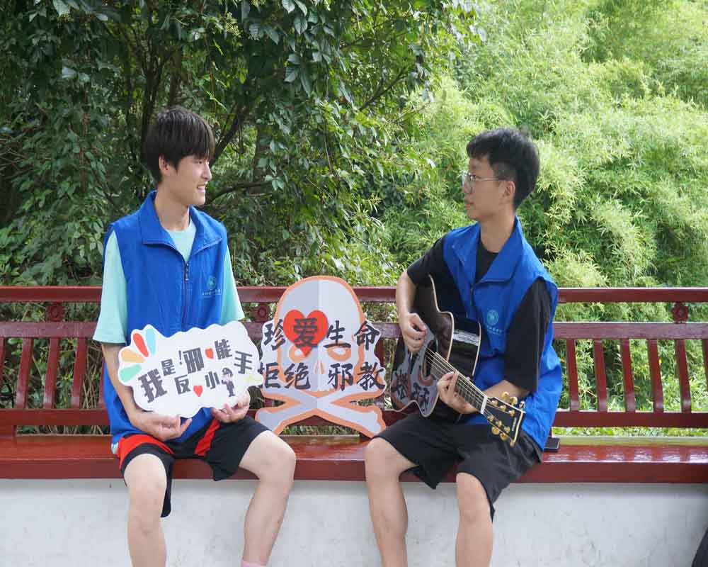 图为实践队员在公园内通过吉他弹唱反邪歌曲进行宣传。
