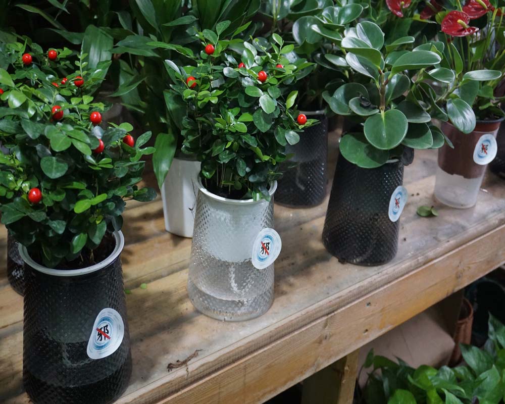 实践队员在花鸟市场为盆栽贴上反邪标签。