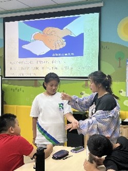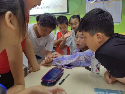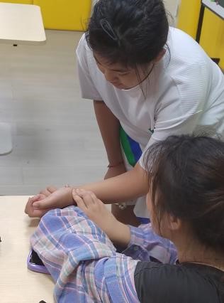 队员们以讲解和实操相结合的方式开展切诊课堂,同时为小朋友们准备了拼图等小奖品,鼓励小朋友们积极参与,感受自己的脉搏律动。其中队员们着重介绍了观小儿示指络脉和切诊这两种方法,从小儿特殊的脉象入手,让小朋友们将自己的脉搏和实践团成员的脉搏进行对比,初步了解诊断的因时因地因人原则以及“望闻问切”的小技巧。宣讲过后,小朋友们都跃跃欲试,相互把起脉来,队员指导并且纠正了手法。在体验过程中,小朋友们结合自己的生活经验提出了许多关于脉率的问题,实践团成员们深入浅出,耐心解答了原理和现象,积极鼓励小朋友们加深对中医药文化的学习。