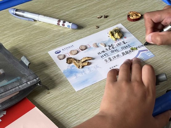 小朋友们发挥奇思妙想,在明信片上以中药材为墨作画,并根据所学中药材相关知识,亲笔写下相关中药材的性味、归经及主要功效,在亲自动手的过程中加深了对中药材的理解,让中药课堂所学知识变得更加深刻。