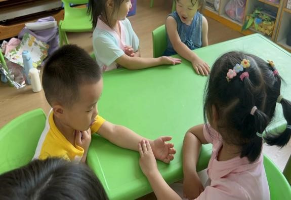 队员们首先向孩子们讲解浮、沉、迟、数、虚、实的脉象及特点,并结合“听、看、学、做”的方法引导孩子们互相合作,实践切脉的过程。摸到小伙伴的脉后,小朋友们都睁大眼睛,张圆嘴巴,感叹“好神奇”!