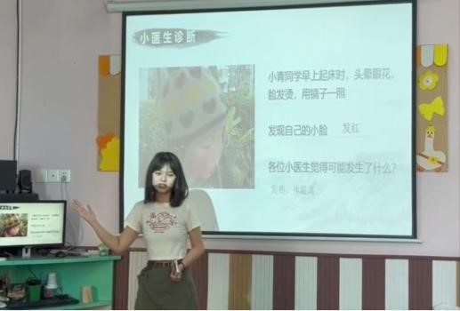 队员们运用温和亲切的提问,吸引小朋友们的注意;呈现生动形象的图画,加深小朋友们的印象;使用简单易懂的讲解,引发小朋友们的思考。在课堂上,小朋友们理解了五色主病的内容和司外揣内的概念,当场跟自己的小伙伴互相“望诊”。