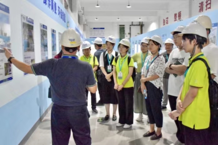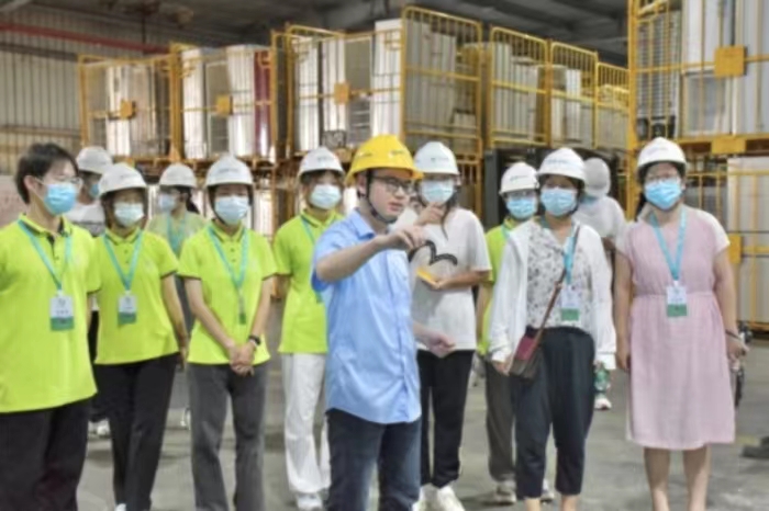 在做好安全防护后,实践队队员跟随讲解员来到处理厂的工作车间,讲解员介绍道,公司的流水线生产严格遵循各项规定,以绿色产业和低碳技术为基础进行运作,且严格把控水、电和煤的使用,高效回收废弃电器电子产品,提高废弃物综合利用率。