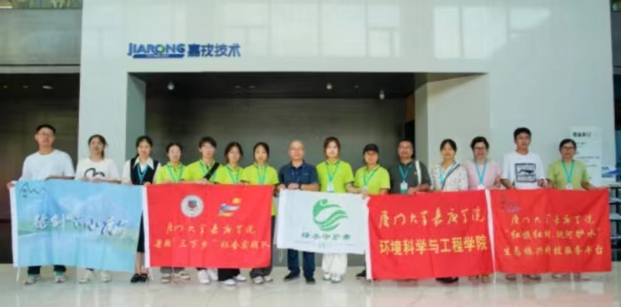 活动的第二站实践队来到厦门嘉戎技术股份有限公司,在产品工程师的邀请下,实践队队员走进企业园区了解企业的概况、发展历程、核心技术和应用方向。在观看了企业宣传纪录片后,实践队队员了解到嘉戎技术是一家以膜分离装备、高性能膜组件等产品的研发制造与应用技术为核心,提供高浓度污废水处理及清洁生产综合解决方案的国家高新技术企业。