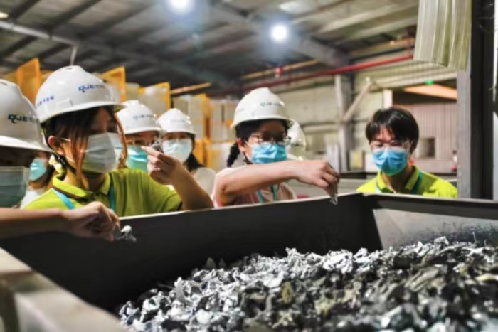 移步产业园展厅中,讲解员向实践队队员们揭晓了废弃电器电子产品的“内部秘密”,破旧的外壳下是各种金属与非金属零配件。讲解员告诉实践队队员这些零配件即将迎来它们的第二次“生命”,在被拆解后,它们会依据不同材料进行分类,送至流水线进行再生利用。在赋予这些废弃物全新形态时,不仅降低产业的碳排放量,还减轻了重金属污染,减少了固体废物产生,真正实现了绿色低碳循环处理。