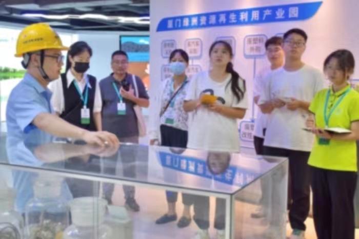 此次活动的第一站是厦门绿洲环保产业有限公司,通过观看企业的宣传记录片实践队队员了解到厦门绿洲环保产业有限公司是第四批国家“城市矿产”示范基地,多年来致力于废弃电器电子产品回收拆解及处理,年处理能力高达30万吨废弃资源,实现园区整体资源资源化、减量化、无害化。