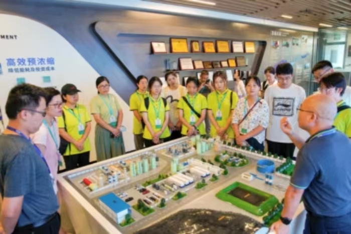 同时,项目负责人利用沙盘模型向实践队队员分享已解决项目的成果案例,并提到:近年来,膜技术在饮用水深度处理、美丽乡村计划—农村污水治理、市政污水、工业废水提标工程、废水深度资源化、特种行业物质分离和提纯等领域应用中呈现的物料高精度过滤、处理效果稳定、有效实现资源循环利用等特点,使膜技术的应用领域进一步拓宽,展现出良好的发展前景。