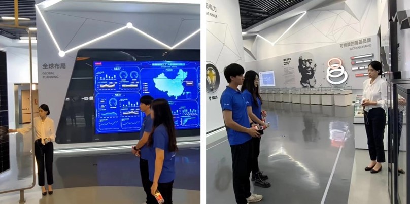 随后,在隆基绿能樊洋平老师的带领下实践队员们参观了总部园区内的隆基绿能智慧能源展览馆。展馆囊括了从单晶硅片制造到光伏电站系统的太阳能光伏全产业链的各个环节,展示了隆基在每个环节的专业能力和领先技术。通过全景投影、互动屏幕等多种手段,实践队员们对隆基产品在实际应用中的效果和可行有了深入了解。