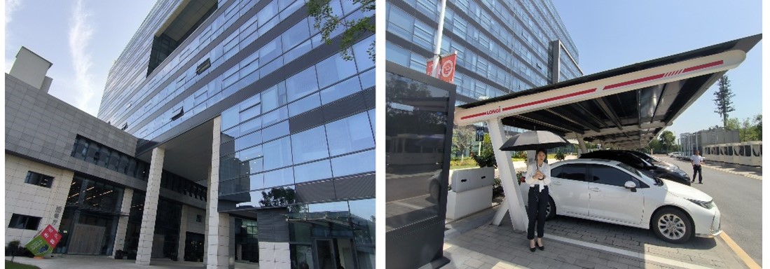 在环境优美的园区内,看似不起眼的大楼外墙也充满玄机。隆基园区内各类建筑的幕墙都铺设了太阳能发电设备,这种能够将太阳光转化为电能的建筑材料可以用于建筑物的各个部位,实现电力的自发自用或并网发电。园区内还设置了多个光储充一体绿电车位,不仅实现了清洁能源生产、应用与储存的连接,更传递了绿色低碳的生活理念。