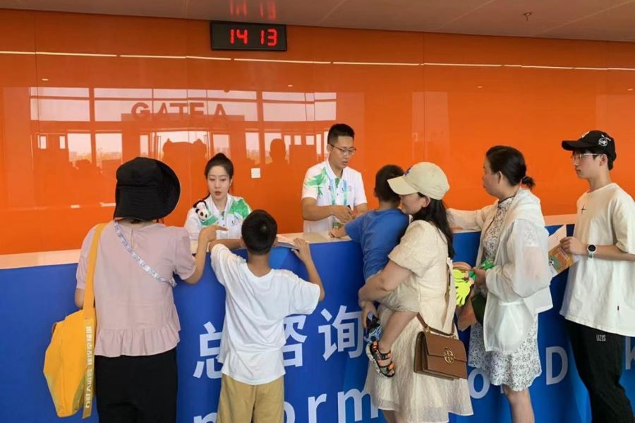 进入大门,映入眼帘的是总咨询台,那里的志愿者们任务最为繁重,他们需要负责婴儿车的寄存,轮椅的借还,分发观众指南等宣传资料,协助观众完成实体打卡和电子打卡;同时咨询台的志愿者还需熟知场馆各区域地址以及路线,清楚每日赛程安排和购票的相关信息,只有做到烂熟于心,才能在面对观众询问时从容不迫。如遇观众投诉,则需要第一时间安抚情绪,记录内容,并及时上报主管。他们的工作很细碎繁琐,但是志愿者之间团结协作,互相帮助,耐心倾听每一位观众的询问,仔细解答每一位观众的问题,为观众服务贡献青春力量。
