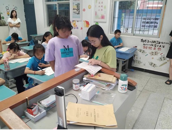 图为志愿者指导学生完成假期作业,让学生们度过一个愉快的假期。通讯员 文逸凡 摄