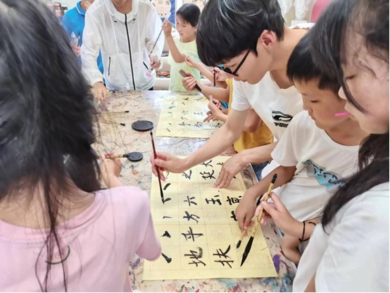 图为志愿者们指导同学们学习书法,领略书法之美和中国文化的博大精深。通讯员 刘畅 摄